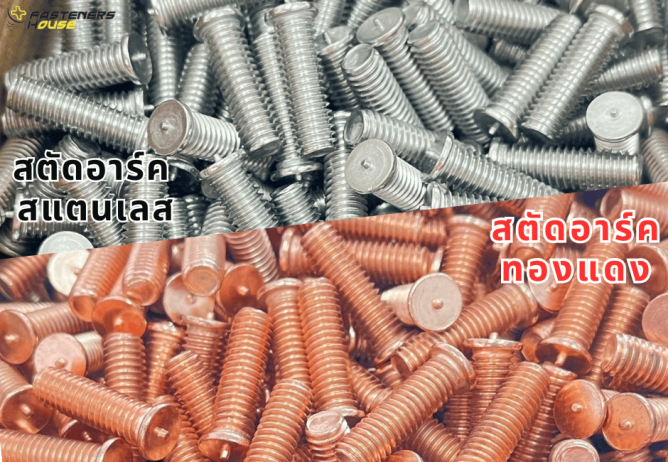 สตัดอาร์คสแตนเลส วัสดุ: ผลิตจากสแตนเลส ป้องกันสนิมได้ดีพอสมควร คุณสมบัติ: ทนทานต่อการกัดกร่อน ทนทานต่อุณหภูมิสูง มีความแข็งแรง และมีอายุการใช้งานยาวนาน ป้องกันสนิม เหมาะสำหรับงานที่ต้องการความทนทานต่อการกัดกร่อนสูง งานที่อยู่สภาพแวดล้อมที่รุนแรง หรือความแข็งแรงสูง เช่น งานโครงสร้าง งานอุตสาหกรรม และงานภายนอกอาคาร เป็นต้น สตัดอาร์คทองแดง วัสดุ: ผลิตจากทองแดง ในการนำไฟฟ้าและนำความร้อนได้ดี คุณสมบัติ: นำไฟฟ้าและนำความร้อนได้ดี มีความเหนียวและยืดหยุ่น ทนทานต่อการกัดกร่อนบางชนิด เหมาะสำหรับงานที่ต้องการนำไฟฟ้าและความร้อนที่ดี เช่น งานไฟฟ้า งานประปา งานท่อ และงานที่ต้องการความยืดหยุ่น เป็นต้น